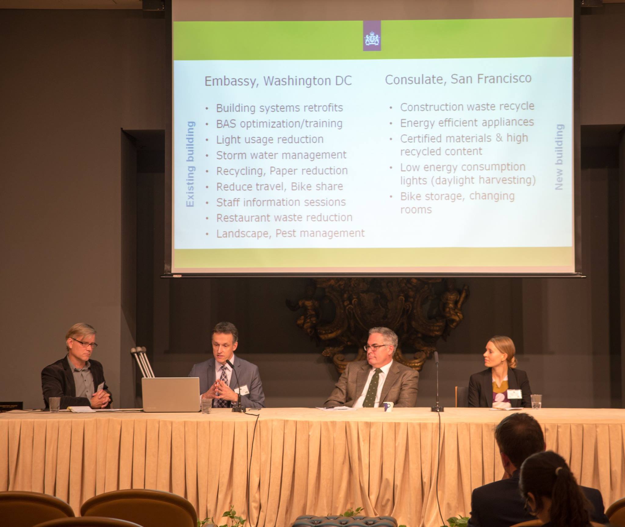 Marcel van Doorn, Head of Internal and Consular Affairs of the Netherlands Embassy, joined colleagues from the Canadian and Finnish embassies in a panel discussion about their efforts to attain LEED certification.