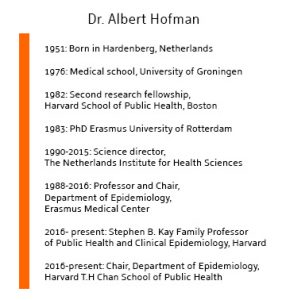 Epidemiology is “the quantitative part of medicine,” Dr. Hofman said. It is this formalized way of studying the causes of a disease that fascinates him and which is why he chose to specialize in this field at the department of epidemiology at the Erasmus University in Rotterdam and Harvard in Boston in the late 1970s.