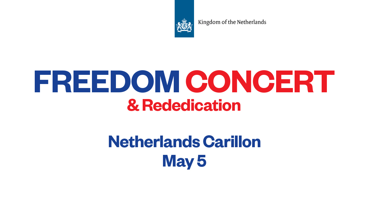 Each year on May 5, the Netherlands celebrates Liberation Day, or the restoration of its freedom in 1945. It is therefore on this day that the embassy will present an annual “Freedom Concert.” We will celebrate our freedom and friendship with a selection of classic and modern arrangements played by American and Dutch carillonneurs at the Netherlands Carillon, and we will reflect on freedom by means of a “freedom speech” by American and Dutch speakers.