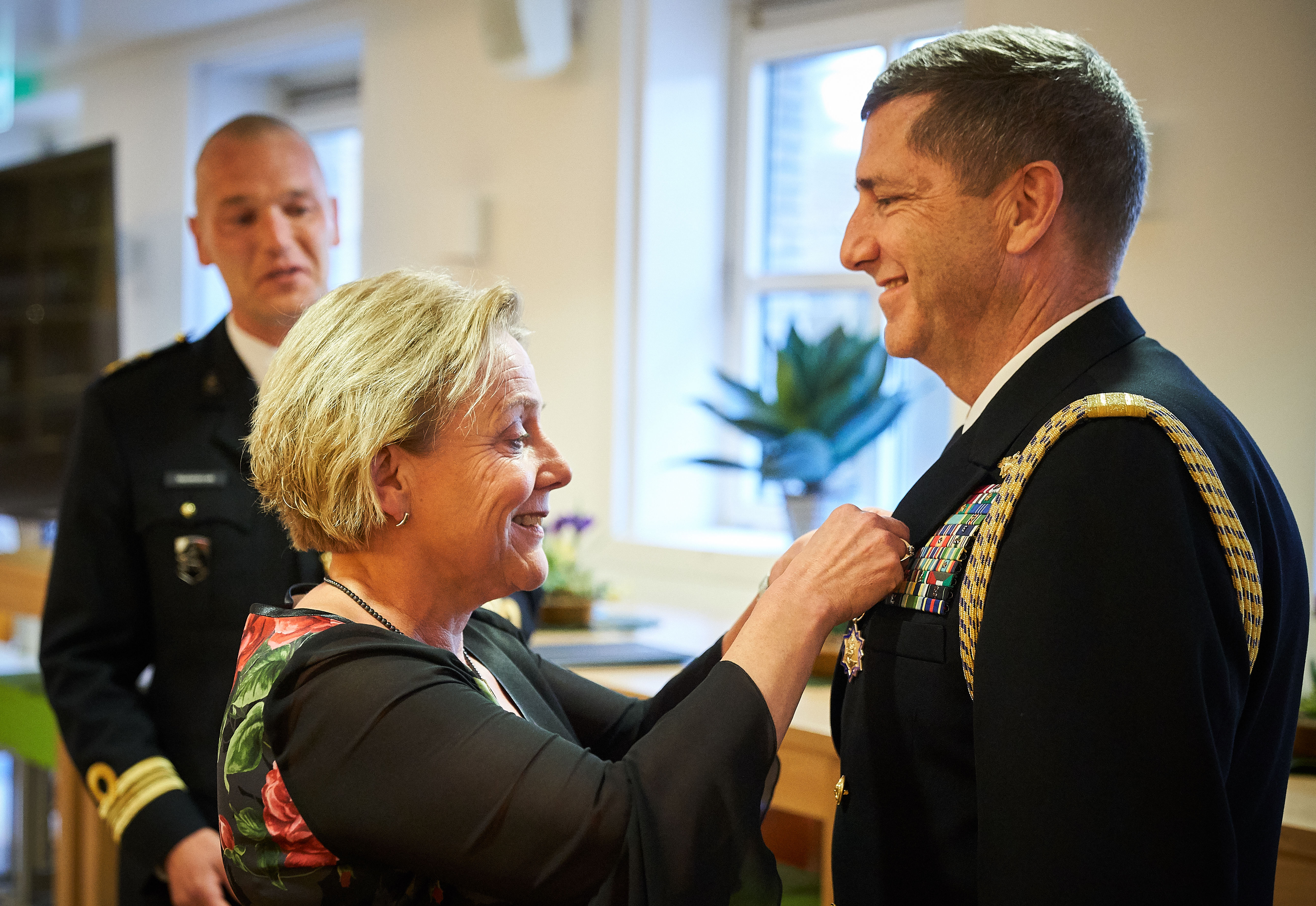 Defense Minister Ank Bijleveld-Schouten awards US Captain Robert Buzzell the Netherlands Decoration of Merit in Gold (Ereteken voor Verdienste in goud). Photo: Ministry of Defense